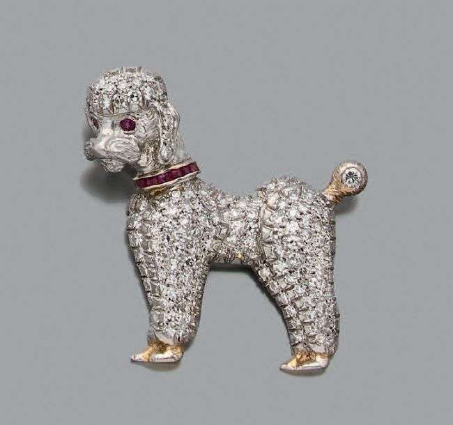 Un clip caniche tout or jaune signé CARTIER https: //brilliancejewels.com/product/ cartierpoodlebrooch/