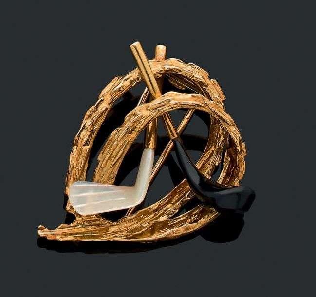 A nacre, onyx and gold clip, signed.