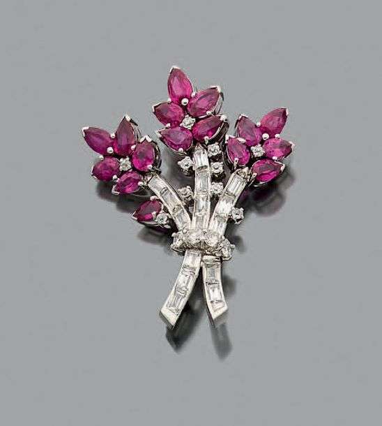 A diamond, ruby and gold brooch.