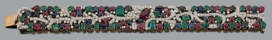 An emerald, ruby, sapphire and gold bracelet.