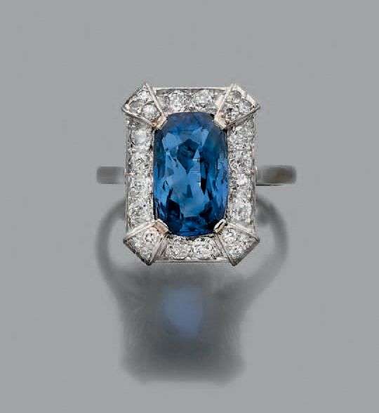 A sapphire, diamond and platinum ring, report.