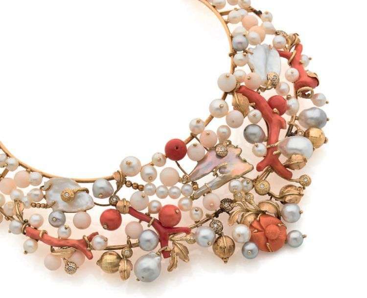 A coral, pearl, nacre, diamond and gold necklace.