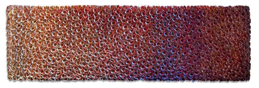 庄红艺的浮雕般的作品,尤其是《花坛》系列,创作极尽细致,近乎 苦行。实际上,他是用宣纸折叠出数千朵花,然后洒上颜料并一朵 朵地进行修饰润色。作品具有引人入胜的视觉效果,因为它会随观 众位置的移动而变化。庄红艺展现了花朵的姹紫千红,同时又让全 部色彩保持在虹色的基调中。