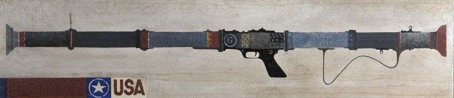 L’œuvre Bazooka s’inscrit dans ce contexte. A l’image du mouvement Arte Povera, l’artiste accorde une importance particulière au choix du support, qui n’est ici pas anodin. La pièce de carton rectangulaire met en valeur la verticalité et la longueur de l’arme. La perfection des détails et des inscriptions en fond une frise minutieuse, rappelant le style des frises publicitaires de l’époque.
