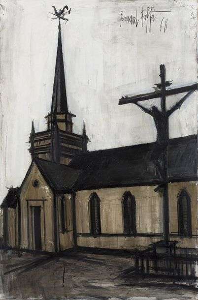De 1965 à 1970, Bernard Buffet dispose d’un atelier, « La Vallée » à Saint-Cast en Bretagne. Durant ces cinq ans de parenthèse bretonne, Bernard Buffet peint la région, ses villages, ses monuments, ses ports et ses navires. L’Eglise de Landerneau, peinte en 1968, s’inscrit dans cette période. Il s’agit d’une huile sur toile de grand format à la palette sombre et aux lignes tranchantes si propres à son style. La composition met en avant la monumentalité de l’édifice, tandis que le parallèle entre le clocher et le calvaire au premier plan incite le spectateur à lever les yeux vers un ciel plus clair: autant d’éléments qui renvoient à la dimension mystique de l’œuvre de Bernard Buffet.