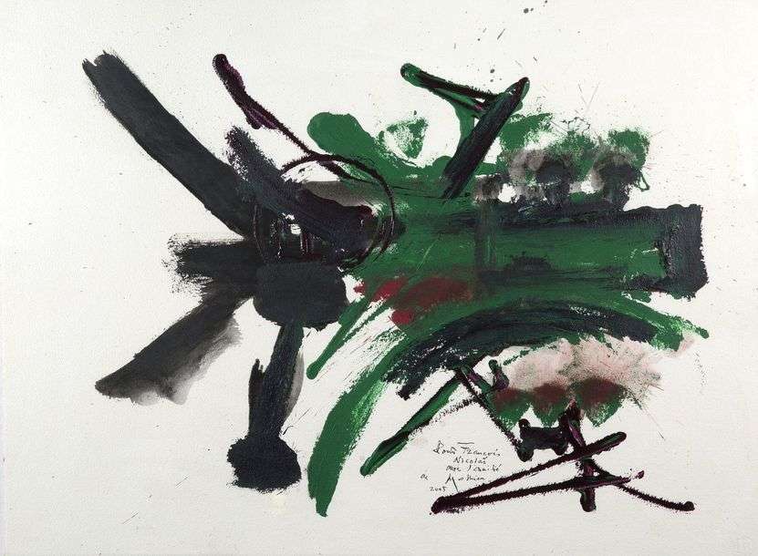 Les deux œuvres suivantes regorgent de spontanéité et de vivacité et tendent encore davantage vers l’abstraction. L’une présente d’épais tracés noirs déchirants, d’où se dissimule même la signature de George Mathieu, comme partie intégrante de l’œuvre. Sa dédicace y est également glissée, signe d’un acte franc et personnel. L’artiste semble y avoir déployé toute son impulsivité | on y devine même les mouvements de son corps, tant le format de la toile est imposant. Les couleurs complémentaires accentuent l’émotion suggérée par le tracé : le vert sapin répond à la petite tache rouge dissimulée au centre, qui pourtant capte toute l’attention du regard.