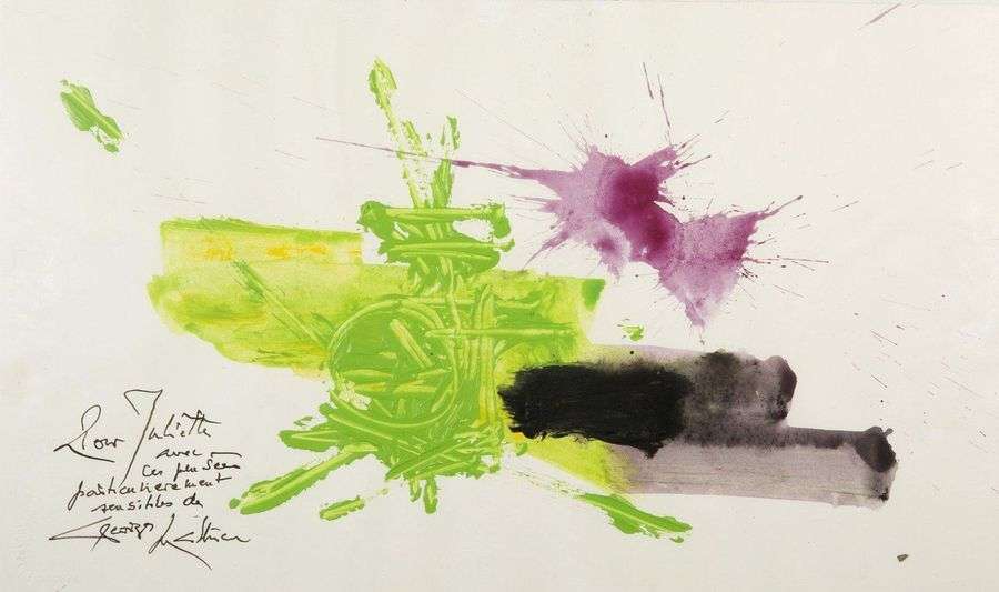 L’impulsivité de la deuxième œuvre, est, quant à elle, plutôt traduite par deux violents jets de peinture interrompant deux brèves lignes horizontales. Tandis que le premier éclat d’encre parme a été laissé tel quel, le second, en acrylique vert pomme, semble avoir été trituré à la manière des signes de calligraphie asiatique dont il tire tant d’inspiration.