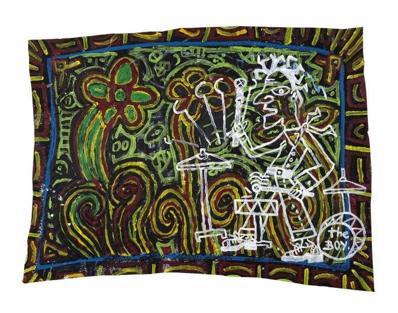 Acrylique sur tissu, titrée en bas à droite, signée, datée au dos, signée et datée cinq fois en bas au centre, signée en bas à droite.Acrylic on textile, titled lower right, signed, dated on reverse, signed and dated five times lower center, signed lower right 73.5 x 95.6 cm