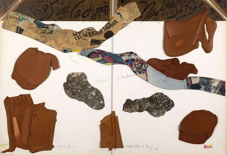 Nouvelles de France, réalisé pendant la période africaine de Télémaque, évoque un courrier reçu de France en Afrique, aussi bien par sa composition que par ses couleurs. La bande brune en haut de la toile suggère l’ouverture d’une enveloppe, tandis que les inscriptions au crayon révèlent des bribes de messages, tantôt d’une écriture appliquée, tantôt griffonnés de manière spontanée. Les Nouvelles de France sont évoquées de façon plus directes par des morceaux de journaux, dispersés sur la toile, mais suivant un agencement ordonné, comme l’agencement des différents messages qui composent une lettre. La texture et la couleur chaude de la terre cuite africaine complètent les journaux français froissés et aplatis.
