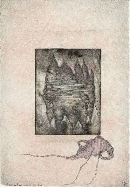 On retrouve encore dans L’autre passé le dessin minutieux d’une figure organique, suggérant un cœur, comme si Deux donnait à voir l’intérieur de son corps. Le grillage extrêmement fin qui recouvre la surface de la feuille évoque un bandage médical, comme tâché de sang par ces gouttes de gouache écarlate. On ne peut s’empêcher d