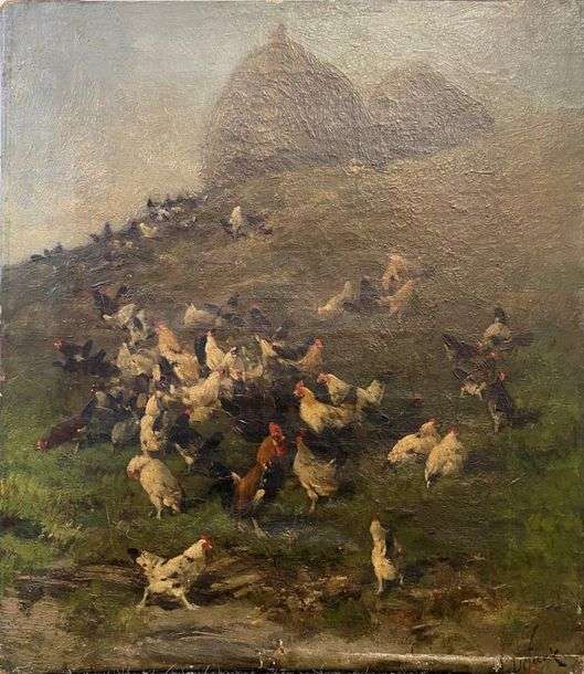 Manques, usures, griffures toile retendue sur nouveau châssis. Plusieurs petits trous à signaler. Nettoyage et restauration conseillés.