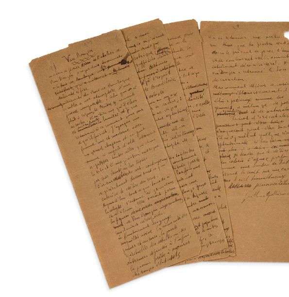 Belle évocation de l'art de Kees Van Dongen à l'occasion d'une exposition de ses oeuvres à la galerie Paul Guillaume (1730 mars 1918). Ce manuscrit de premier jet, avec des ratures et corrections, a servi pour l'impression de l'article, qui a paru le 15 mars 1918 dans le n°1 de la revue Les Arts à Paris, actualités critiques et littéraires des arts et de la curiosité, fondée par le galeriste Paul Guillaume, et dont Apollinaire fût le rédacteur des deux premiers numéros, avant sa mort le 9 novembre 1918, huit mois après cet article. [Apollinaire, OEuvres en prose complètes, Pléiade, t. II, pp. 1404-1406].