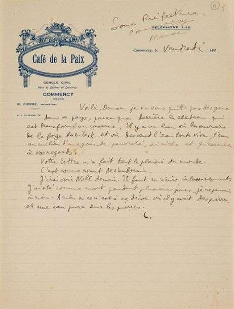Meuse, Commercy, «Vendredi 192[.]» [circa 1924], 1 page in-4 à l'encre sur papier ligné à entête du «Café de la Paix. Commercy».