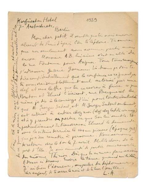 Berlin, [1929], 1 page in-4 à l'encre noire sur papier. «Monsieur A. B. [Breton] lui-même s'est en allé de la rue Fontaine pour Avignon. Pour tous renseignements s'adresser galerie Goemans. Là-dessus je dois te dire confidentiellement que la confiance ne régnant pas tu seras vraisemblablement seul autorisé par une clef et une lettre que tu recevras à faire ce que Breton et Eluard t'écriront rue Becquerel. [...]».