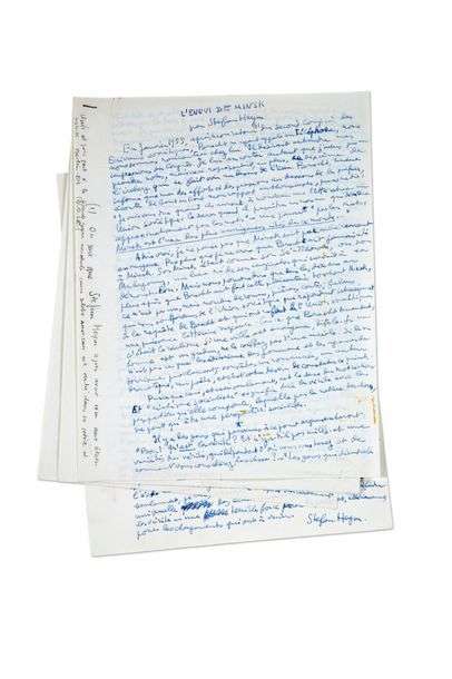 Manuscrit autographe à l'encre bleue de Louis Aragon relatif à la ville de Minsk, à Bertolt Brecht et au romancier allemand Stefan Heym, au réalisme, à la vérité en littérature, et sur les droits et devoirs des écrivains dans le socialisme. «Après mon retour du second congrès des Ecrivains soviétiques, Brecht m'ayant appelé au téléphone, nous nous sommes rencontrés chez lui. Il désirait entendre mes impressions des Congrès. [...] Brecht mieux informé que moi me dit «Je vais vous dire quand ils auront à nouveau une littérature en Union Soviétique. Ce sera quand il paraîtra un roman qui débutera approximativement par les mots: Minsk est l'une des plus ennuyeuses cités dans le monde [...]».