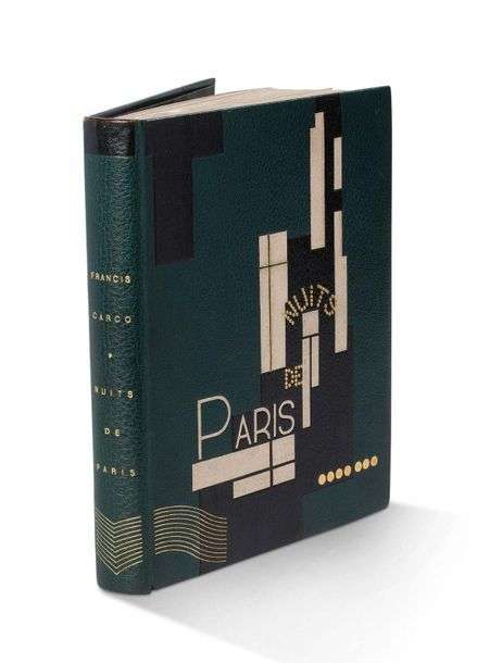 Paris, Au Sans Pareil, 1927. In-4, plein maroquin vert canard, composition mosaïquée de pièces de maroquin noir et blanc évoquant des silhouettes d'immeubles dans la nuit, dos lisse titré or, doublures de maroquin vert canard agrémenté de points dorés figurant les lumières de la ville encadrant un rectangle de moire chocolat, gardes de moire chocolat, couverture et dos conservés, chemise et étui (signée de Pierre Legrain et datée de 1927).
