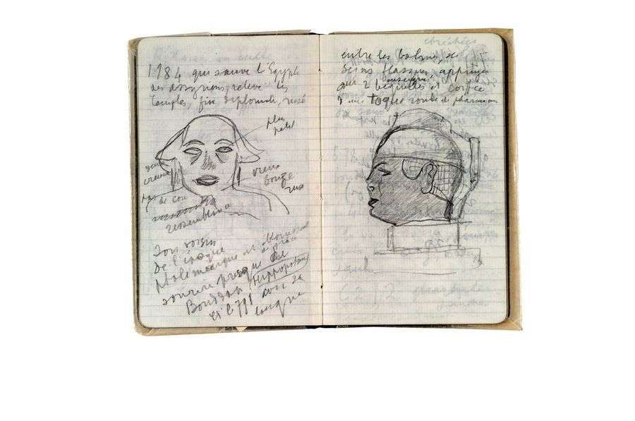 Carnet de notes de son voyage en Égypte, en 1932, dans le cadre d'un reportage sur la drogue et les stupéfiants| Carco visita alors Alexandrie et Le Caire, et fit la connaissance d'Éliane Négrin, sa seconde femme. Ce carnet, rempli de notes prises sur le vif et de récits, principalement au crayon, a pu alimenter le roman Palace Égypte (Albin Michel, 1933), et a servi à la rédaction des Heures d'Égypte (Avignon, 1940), titre porté tardivement par Carco à l'encre bleue en tête du carnet. Aperçus depuis le bateau sur le Nil ... «Pyramides fond d'or sur le sable rose puis orangées, safran renvoyant la lumière tout est hâlé, d'une harmonie altérée de douceur». Il note le nom de l'abbé Drioton, conservateur du musée du Caire, des détails sur les Arabes, les chiens et les arbres| il observe la conduite des femmes voilées dans les jardins de l'Ezbekieh et dans la rue| il s'entretient avec un archéologue et inscrit des noms égyptiens et européens...
