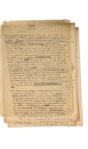 Manuscrit autographe comportant de nombreuses ratures et corrections de Cocteau. Visite est un beau texte onirique et tragique dans lequel un soldat tué sur le front s'adresse à Jean Cocteau: «J'ai une grande nouvelle triste à t'annoncer: je suis mort je peux te parler ce matin parce que tu somnoles, que tu es malade, que tu as la fièvre» «Chacun de nous est une bouteille qui imprime une forme différente à la même eau. Maintenant retourné au lac, je collabore à sa transparence, je suis nous, vous êtes je, les vivants et les morts sont prêts et loin les uns des autres comme le côté pile et le côté face d'un sou, les quatre images que propose un jeu de cubes. Notre rayon à nous traverse les murs. Rien ne l'arrête. Nous vivons épanouis dans le vide [...]». Publié dans «Discours du grand sommeil» et repris dans les OEuvres poétiques complètes, pages 444-446.