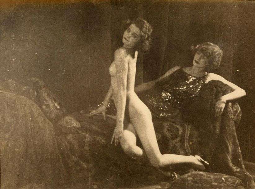 Tirage argentique d'époque représentant deux femmes sur un sofa, l'une habillée, l'autre nue.
