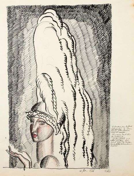 Dessin sur papier et encre de Chine, crayon noir et de couleur avec annotations de l'artiste monogrammé en bas à droite et daté «12 février 1926».