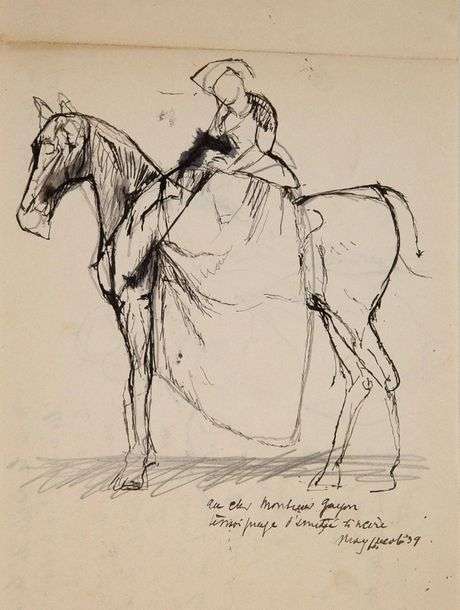 Sur le côté, esquisse à la plume d'une amazone à cheval, sa longue jupe tombant presque à terre Au verso, en hauteur, un dessin plus élaboré de cette amazone, à la mine de plomb et à la plume, est dédicacé: «au cher Monsieur Gayon témoignage d'amitié sincère Max Jacob 39».