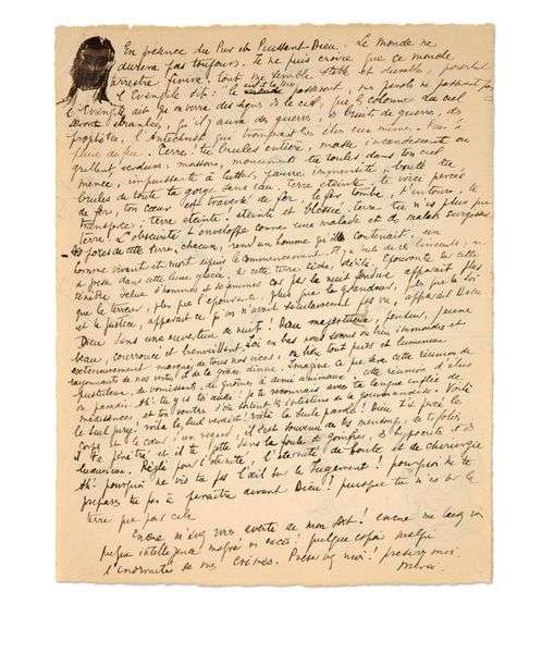 Manuscrit autographe avec dessins représentant la tête de Jésus Christ au recto, et le chemin de croix de Jésus Christ au verso. Beau manuscrit poétique de Max Jacob, anticipant la fin du monde et demandant à Dieu de le préserver malgré ses excès. «Le monde ne durera pas toujours. Je ne puis croire que ce monde terrestre finira, tout me semble stable et durable, pourtant l'Évangile dit: «le ciel et la Terre passeront, nos paroles ne passeront pas». L'Évangile dit qu'on verra des signes dans le ciel, que les colonnes du ciel seront ébranlées, qu'il y aura des guerres, des bruits de guerre, des prophètes, l'Antéchrist qui tromperait les élus eux-mêmes. Puis la pluie de feu. Terre ! Tu brules entière, masse incandescente ou grillent verdures, moissons, monuments tu roules dans ton ciel menée, impuissante à lutter| pauvre immensité, bonté tu brules de toute ta gorge sans eau. Terre éteinte, te voici percée de fer, ton coeur est traversé de fer, le fer tombe, t'entoure, te transperce. Terre éteinte ! éteinte et blessée. Terre tu n'es plus que Terre. L'obscurité l'enveloppe comme une malade et des malades surgissent [...] Il y a foule de ces linceuls, on se presse dans cette lune glacée, sur cette terre sèche, stérile. Épouvante sur cette ténèbre velue d'hommes et de femmes car par la nuit fendue apparaît plus que la terreur, plus que l'épouvante, plus que la grandeur, plus que la loi et la justice, apparaît ce qu'on avait séculairement pas vu, apparaît Dieu. Dieu sans une ouverture de nuit ! Dieu majestueux, penseur, jeune, beau, courroucé et bienveillant [...] Encore m'avez-vous averti de mon sort ! Encore me laissez ma presque intelligence malgré mes excès ! Quelque espoir malgré l'énormité de mes crimes. Préservez moi ! Préservez moi. Merci.».