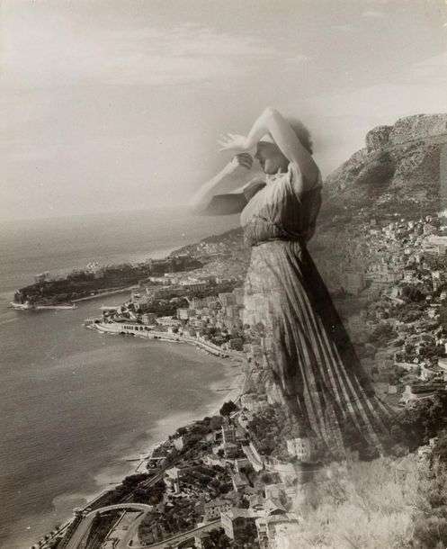 Tirage argentique d'époque de ce photomontage représentant une femme cachant son visage sur les hauteurs de Monte Carlo.