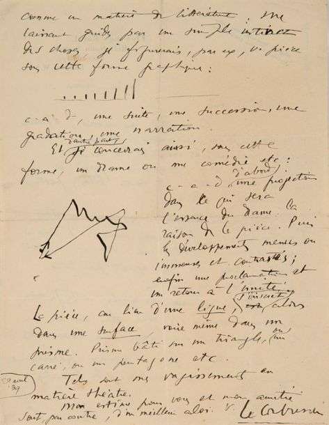 Londres, Fleming's Hotel, 29 avril [19]39, 2 pages in-8 à l'encre sur papier à entête du «Fleming's Hotel». «[...] je me déclare absolument incompétent en matière de théâtre comme en matière de littérature: me laissant guider par un simple intérêt des choses, je figurerais, par ex, u. pièce sous cette forme graphique: [dessin], c-à-d, une suite, une succession, une gradation, une narration. Et d'autre part je concevrais ainsi, sous cette forme, un drame ou une comédie, etc.: c-à-d, d'abord une projection dans ce qui sera l'essence du drame, la raison de la pièce. Puis les développements menus ou immenses et contrastés| enfin une proclamation et un retour à l'unité. La pièce, au lieu d'une ligne, s'inscrit alors dans une surface, voire même dans un prisme. Prisme bâti sur un triangle, ou un carré, ou un pentagone, etc [...]»