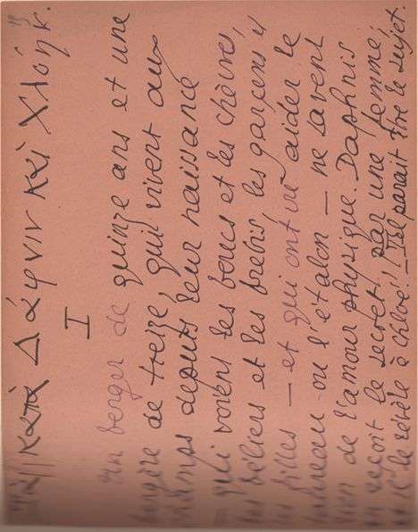 Note autographe inédite à l'encre de Pierre Louÿs, «l'Imbécilité du sujet», sur le conte pastoral Daphnis et Chloé de Longus, auteur grec du IIIe siècle. «[...] Daphnis, chevrier de quinze ans a un troupeau de cinquante chèvres qu'il fait saillir et qu'il double à chaque portée. Il couche toutes les nuits avec Chloé bergère de treize ans, qui voit ses béliers. Ils veulent s'unir et ne savent pas il faut que Lykaïnien révèle à Daphnis le secret de l'amour. Se peut-il qu'un tel sujet le plus bête in the world ait mis au monde Daphnis et Chloé ? [...]».