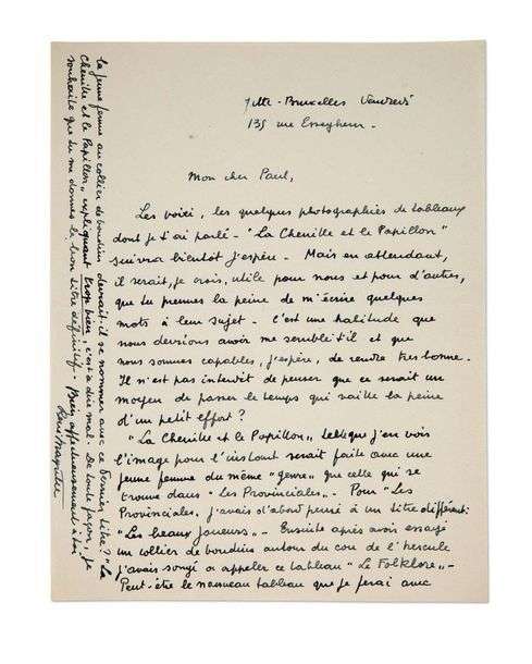 Lettre à Paul Éluard confirmant la volonté de Magritte à demander à ses amis de donner un titre à ses tableaux. «Mon cher Paul, Les voici, les quelques photographies de tableaux dont je t'ai parlé. «La Chenille et le Papillon» suivra bientôt j'espère. Mais en attendant, il serait, je crois, utile pour nous et pour d'autres, que tu prennes la peine de m'écrire quelques mots à leur sujet. C'est une habitude que nous devrions avoir me semble t-il et que nous sommes capables, j'espère, de rendre très bonne.