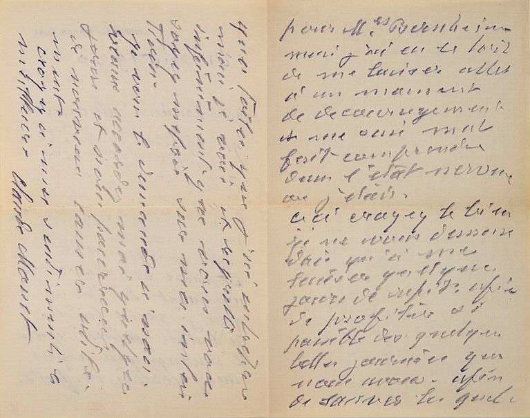 Adressée au critique d'art Arsène Alexandre (1859-1937), à propos des négociations difficiles qui ont abouti à la donation des Nymphéas de Monet à l'État français: «Cher Monsieur Alexandre, je réponds de suite à votre lettre et tiens à vous dire que vous m'avez mal compris. Ce que je vous ai dit lors de votre visite est chose convenue. Au sujet du don que je veux faire à l'Etat, ainsi qu'à l'ouvrage que vous avez accepté de faire pour M. Bernheim, mais j'ai eu le tort de me laisser aller à un moment de découragement et me suis mal fait comprendre dans l'état nerveux où j'étais. Ceci croyez le bien je ne vous demandais qu'à me laisser quelques jours de répit afin de profiter si possible des quelques belles journées que nous avons. Enfin de sauver les quelques toiles que j'ai entreprises mais je vois et regrette infiniment que vous vous soyez mépris sur mes intentions. Je vous le demande à nouveau, accordez-moi quelques jours et nous pourrons de nouveau causer utilement. Croyez à mes sentiments les meilleurs [...]».