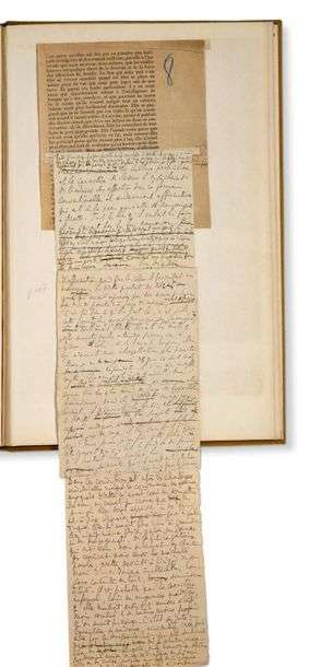 Édition de luxe tirée à 50 exemplaires numérotés sur papier Bible, n° XV, avec portrait de Marcel Proust. Exemplaire bien complet des deux «placards» d'épreuves corrigées par Marcel Proust, dont le premier presque entièrement manuscrit, se rapportant à l'analyse fondamentale pour le roman de la jalousie de Swann pour Odette, a été entièrement remanié et transformé dans l'édition. Le second placard d'épreuves se rapporte, quant à lui, à un passage savoureux concernant les grands écrivains du narrateur rabaissés par la lorgnette anecdotique de Mme de Villeparisis, rejoignant Sainte-Beuve dans sa condamnation des maîtres par le «vécu» de leur caractère. Ces deux placards sont montés à la suite l'un de l'autre à la fin du volume, en parfait état (malgré quelques rousseurs et traces de colle habituelles).
