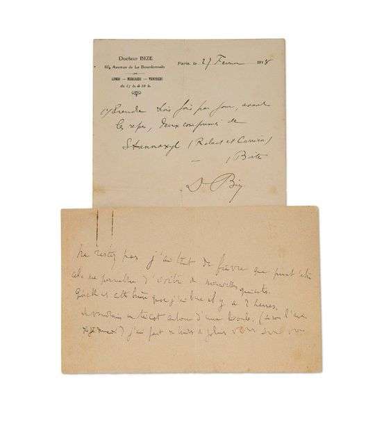 L'on joint une ordonnance du docteur Bize (Paris, 27 février 1918, 1 page in-8 à l'encre sur papier). Marcel Proust faisait souvent venir le docteur Bize, et, sous le prétexte d'avoir besoin de soins, l'interrogeait longuement afin d'enrichir son oeuvre de sources médicales.