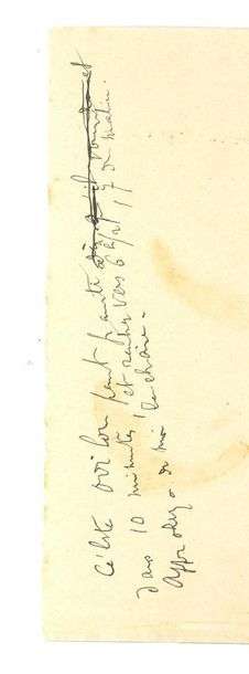 S.d. [18 novembre 1922], 1 page in-8 oblong à l'encre sur papier. (Tâche de bol de café). «Céleste Odilon peut partir dans 10 minutes, et rentrer vers 6h1/2, 7h du matin. Approchez de moi la chaise». Au verso, texte à l'encre de sa main: «J'avais entendu fer au lieu de verre».