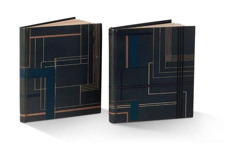 Paris, F.-L. Schmied, 1926. In-4, 2 volumes dont l'un de suites, maroquin bleu, décor géométrique différent pour chaque volume, dessiné par des listels de maroquin blanc, noir, bleu ou beige, quelques pièces bleues plus importantes, deux grands laques en doublure du volume de texte, gardes de faille bleue, non rognés, chemises demi-maroquin, emboîtage (F. L. Schmied - Laque J. Dunand).
