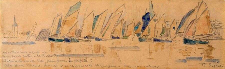 «Croix-de-Vie, le défilé des voiliers», lettre autographe signée avec dessin. [1920], aquarelle et crayon sur papier. 10 cm x 32,5 cm (à vue) sous encadrement. Signé en bas à droite «P. Signac», annotée et dédicacée en bas à gauche «avec tous mes regrets de vous avoir raté à La Rochelle. J'étais à Croix-de-Vie, pour voir le défilé: cela dure deux heures heures [sic] et se renouvelle chaque jour. Bien amicalement».