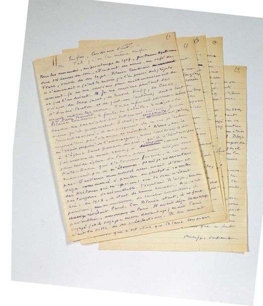 S.d., 5 pages in-4 à l'encre bleue. «[...] Blaise Cendrars, les yeux grand ouverts, s'efforçait de comprendre les bouleversements, qui allaient se produire. Déjà il nous expliquait les conséquences gigantesques de la révolution soviétique en évoquant les souvenirs de son voyage et de son séjour en Russie [...]