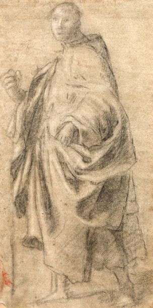 Il peut s'agir ici d'une étude préparatoire pour un plus grand tableau du maitre. L'attention de l'artiste se concentre sur l'ample mouvement du vêtement, rendu à grands traits et dans un clair-obscur vibrant qui confèrent à l'ensemble un effet de douce luminosité qu'accentue le papier préparé gris, d'après une technique fréquemment utilisée dans l'atelier de Fra Bartolomeo.