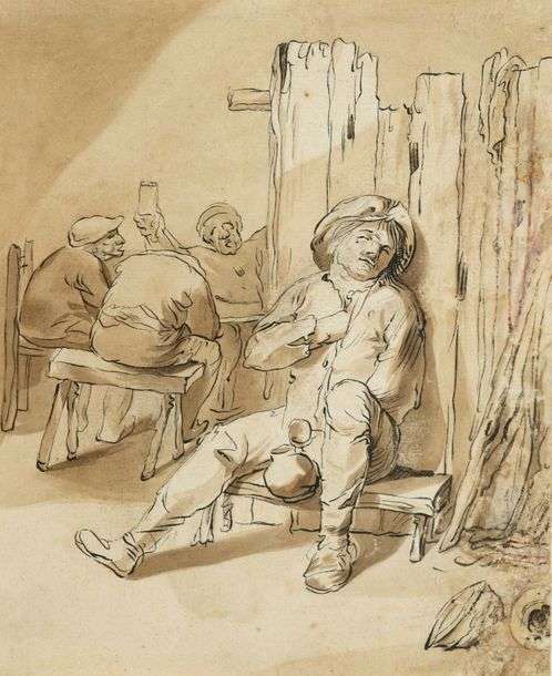 En contribuant au développement du genre des tronies, ces études faciales aux traits exagérés, Brouwer eut une grande influence sur la génération suivante des peintres de genre flamands et hollandais, dont Van Heemskerk. Sa préférence pour les sujets grossiers, comme ici le personnage ivre assoupi sur un banc, une cruche de vin à la main, fonda sa réputation de peintre hautement satirique et souvent frappé par la censure.
