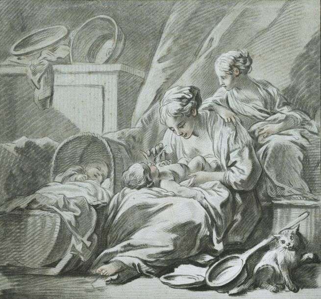Scène domestique: deux mères et leurs bébés