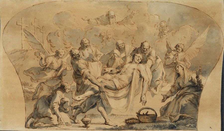 Fontebasso se spécialisa dans les grandes peintures de décor pour les églises et palais aristocratiques dès les années 1740. En 1761, il se rendit à Saint Pétersbourg pour décorer l'intérieur du Palais d'Hiver, dont les décors furent malheureusement détruits. C'est sûrement de cette époque que date ce dessin préparatoire.