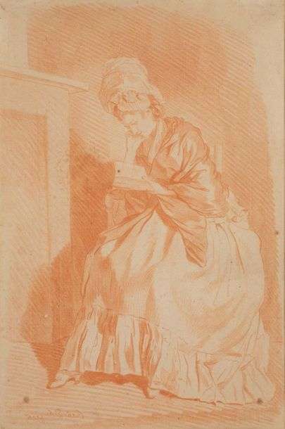 Cette contre-épreuve a été réalisée d'après un dessin-matrice issu d'un célèbre cycle de 58, mettant en scène successivement trois jeunes modèles féminins, Marianne Franmery, Louise-Charlotte Marini et Louise-Elisabeth Bain, croquées dans un intérieur et dans diverses positions charmantes, avec toute la spontanéité, la décontraction et la nonchalance de ce siècle.