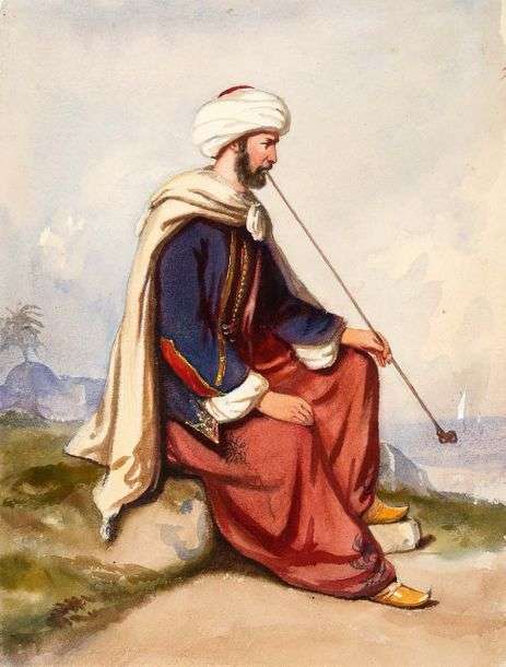 Album amicorum contenant environ dix-sept dessins: Paysage de neige, cavalier oriental d'après Vernet, Pfiferari, Voiliers en mer, Vues et paysages divers...