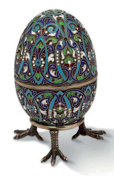 OEUF en argent à décor en émaux polychromes cloisonnés sur fond amati, ouvrant en son milieu et reposant sur une base séparée tripode au motif de pattes d'échassier.