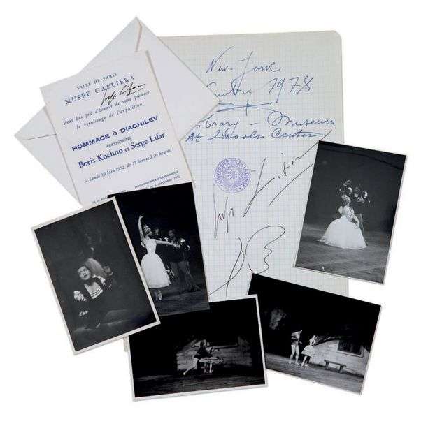 ENSEMBLE DE 9 PHOTOGRAPHIES de Giselle avec Serge Lifar et deux documents dédicacés (9 x 12 cm) par Lifar, dont un faire part pour l'Hommage à Diaghilev organisé par le musée Galliera le 19 juin 1972.