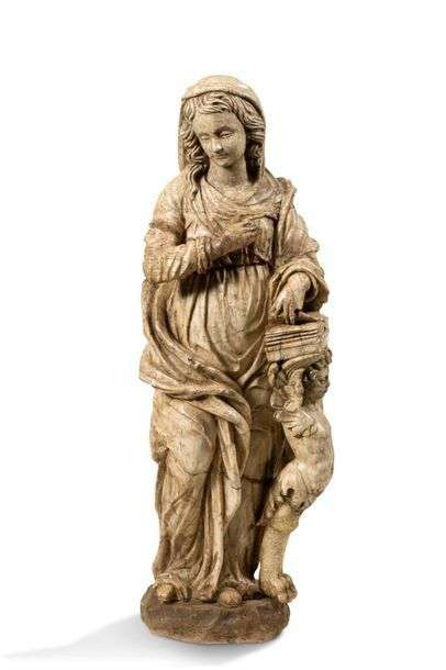 VIERGE DE L'ANNONCIATION en albâtre sculpté. Debout, inclinant légèrement la tête, la Vierge pose sa main droite sur la poitrine, écartant des doigts de son autre main les pages d'un livre posé sur un lutrin dont le piètement est formé par un ange engainé avec pieds griffes | elle est vêtue d'une robe ceinturée et d'un manteau dont un pan revient sur le devant. Seconde moitié du XVIe siècle
