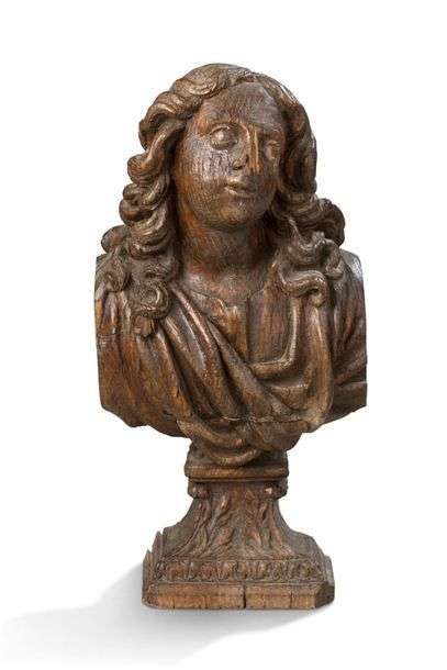 BUSTE DE SAINT JEAN en chêne sculpté, dos ébauché| piédouche monoxyle orné de feuillages et de rais-de-coeur. XVIIe siècle