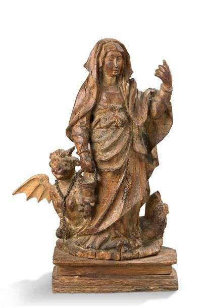 SAINTE MARTHE en noyer sculpté avec restes de polychromie, dos ébauché. Debout, la main gauche levée désignant le ciel, elle tient de son autre main un seau à bénir et la chaîne de la tarasque qu'elle mène en laisse. Terrasse moulurée. Vallée du Rhône, XVIe siècle