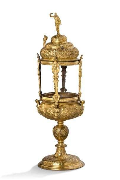 RELIQUAIRE MONSTRANCE en cuivre repoussé, gravé et doré. Monstrance à décor d'anges, de draperies et de groupes de fruits, pied avec noeud gravé des instruments de la Passion et base circulaire. Monstrance : vers 1580 Pied : fin du XVIIIe siècle