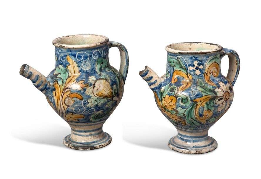 Paire de chevrettes en majolique à décor polychrome fiori e foglie sur fond bleu. XVIe siècle